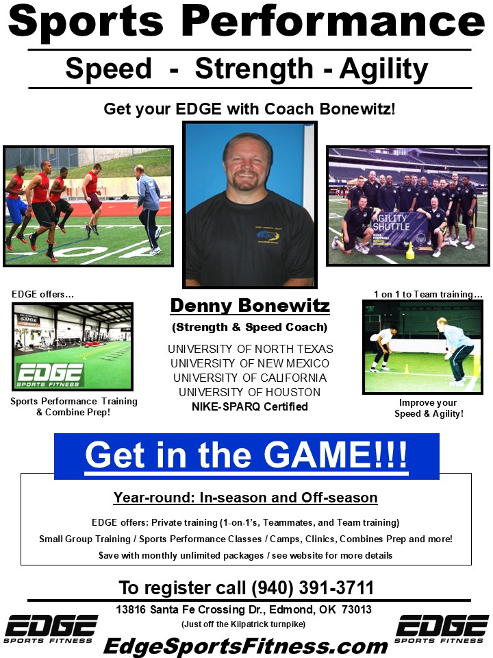 EDGE Sports Fitness offers Sports Performance Training from individuals to teams. Our staff members have all coached at the collegiate and/or pro level and have degrees in exercise science and/or kinesiology. We believe that if you can train like an athlete... you'll develop life enhancing skills that will improve performance, help prevent injuries and promote longevity.